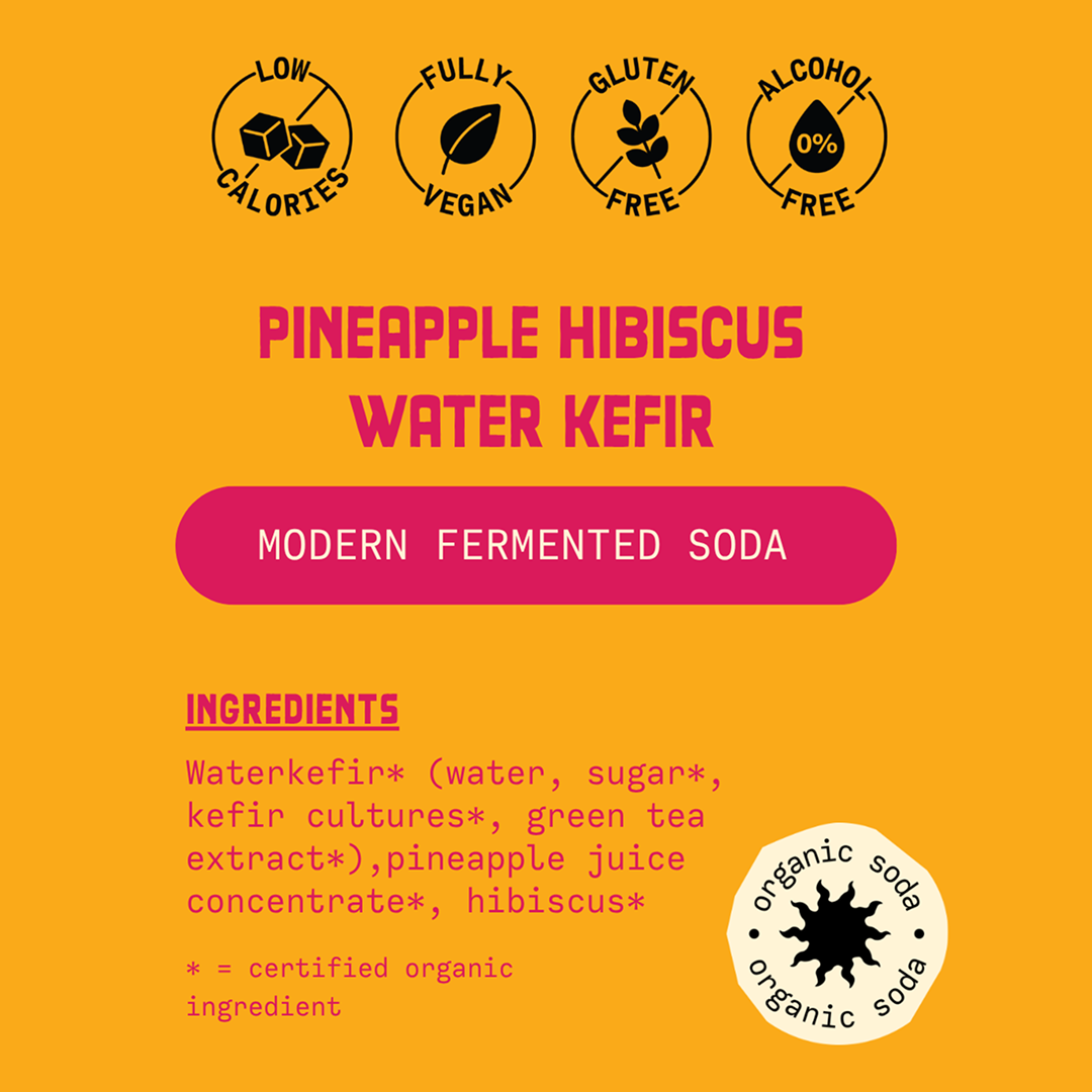 Tart hibiscus meets juicy pineapple in this bold, tropical twist on traditional water kefir. Pineapple Hibiscus is lush, punchy, and just the right kind of tangy. Fermentation adds a gentle sparkle and complexity that lifts the sweetness and keeps it fresh.